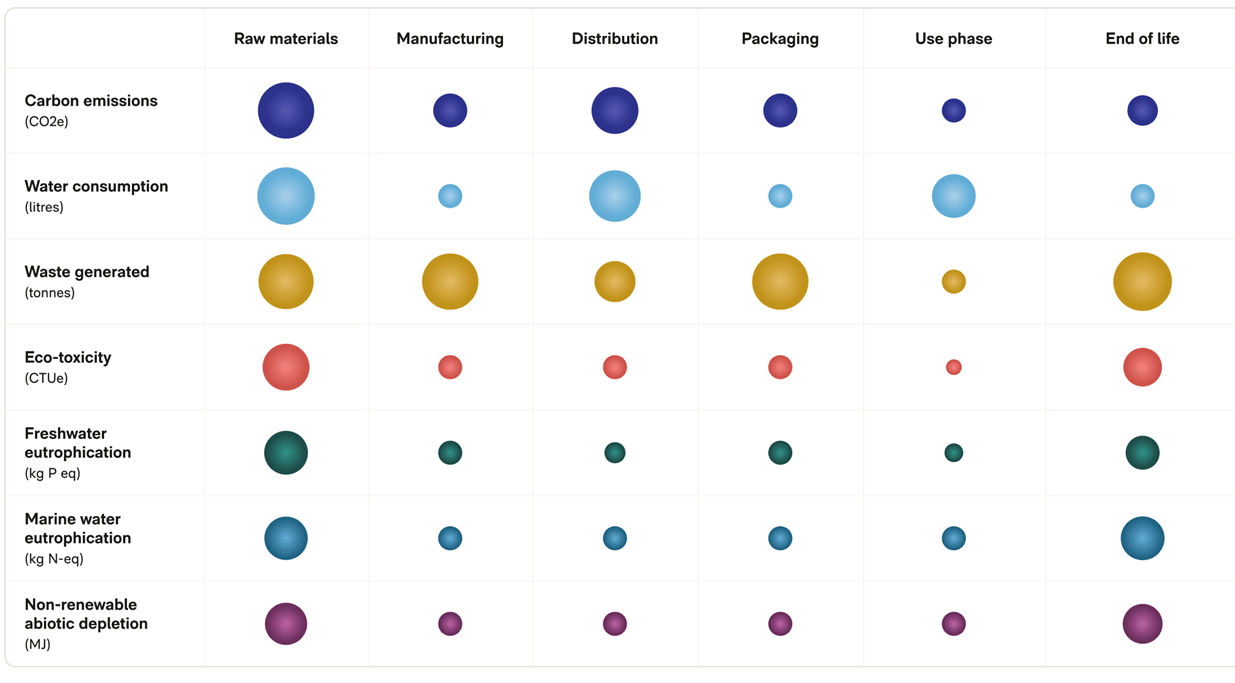 Click to enlarge. And yes, it gets even more complicated — we don’t just have several impact categories; they can also have different time horizons and play a role in various stages of a product’s life cycle. I like this visualization from Vaayu.