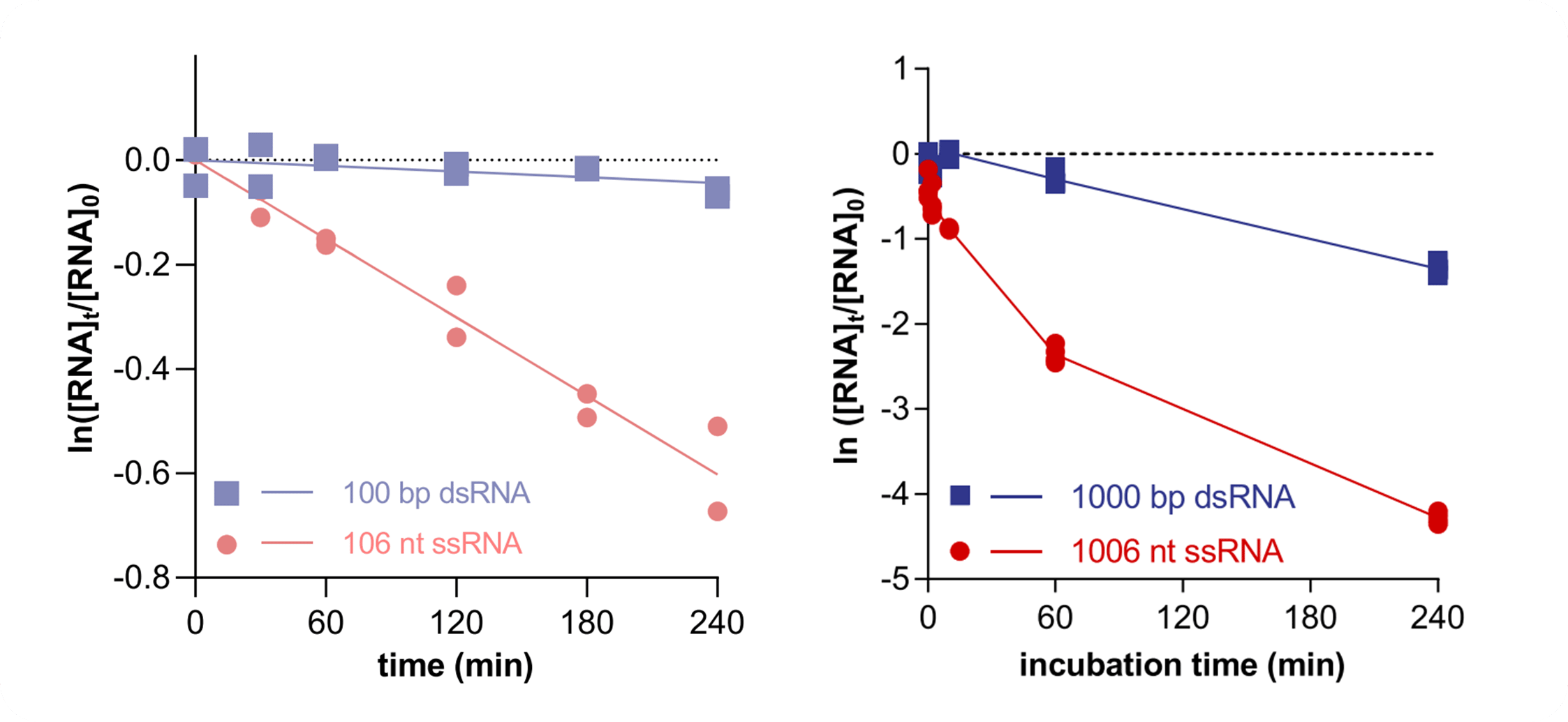 Interestingly, structured or especially dsRNA enhances its stability dramatically⁵.