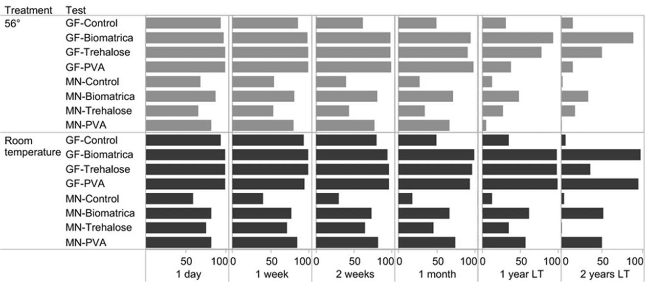 Click to enlarge the adapted figure by Ivanova et al. shows the degradation dynamics at 56 degrees and room temperature for ST panel measured as PCR success (%) per plate. GF and MN refer to the isolation kit from two manufacturers while Biomatrica, Trehalose and PVA are storage conditions.