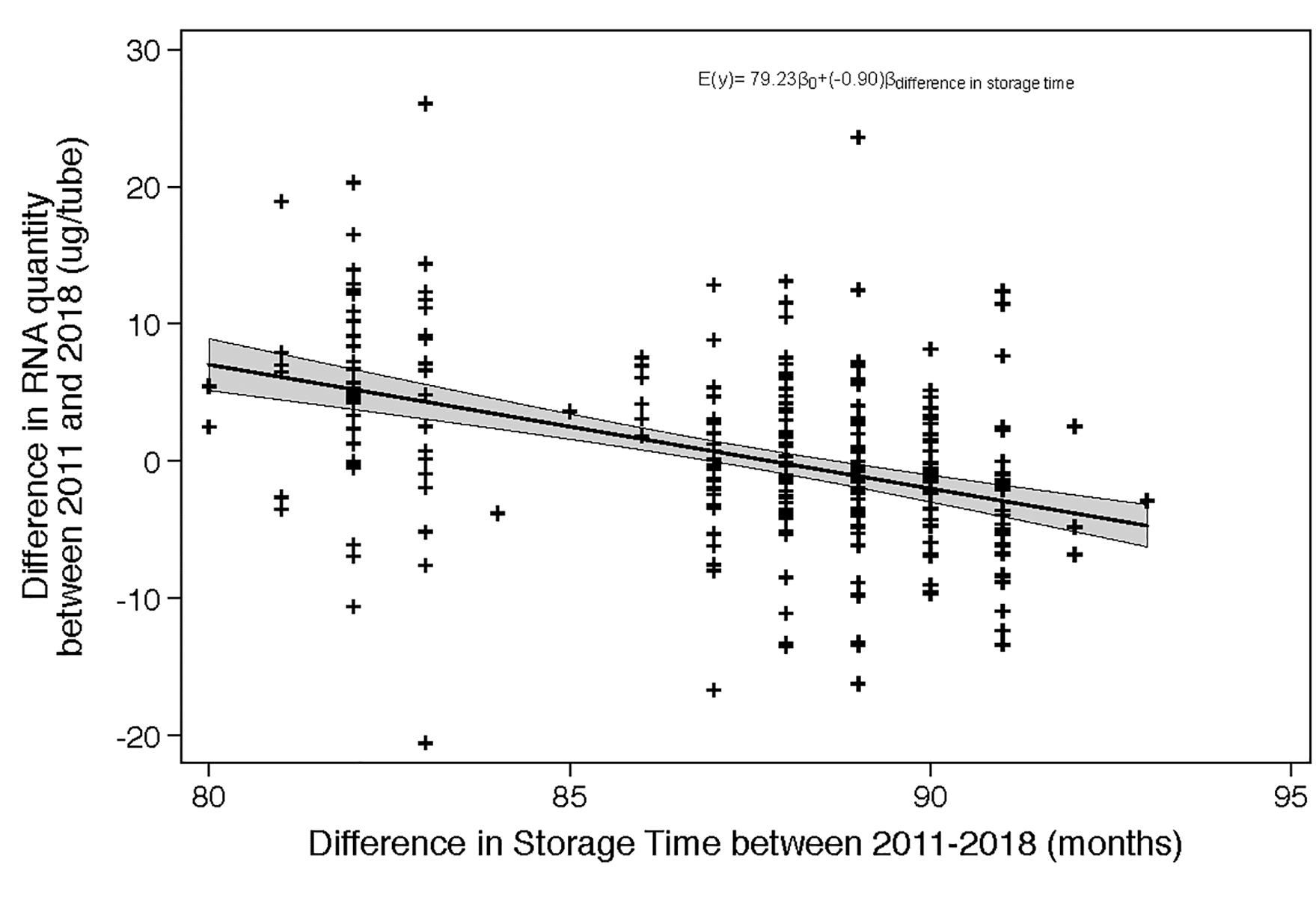 Association between the difference in RNA quantity (2011 μg /tube minus 2018 μg /tube) and length of storage time. The negative slope implies that the difference between 2011 and 2018 increased with storage time, with the 2018 quantity increasing over time. Data by Stephenson et al.