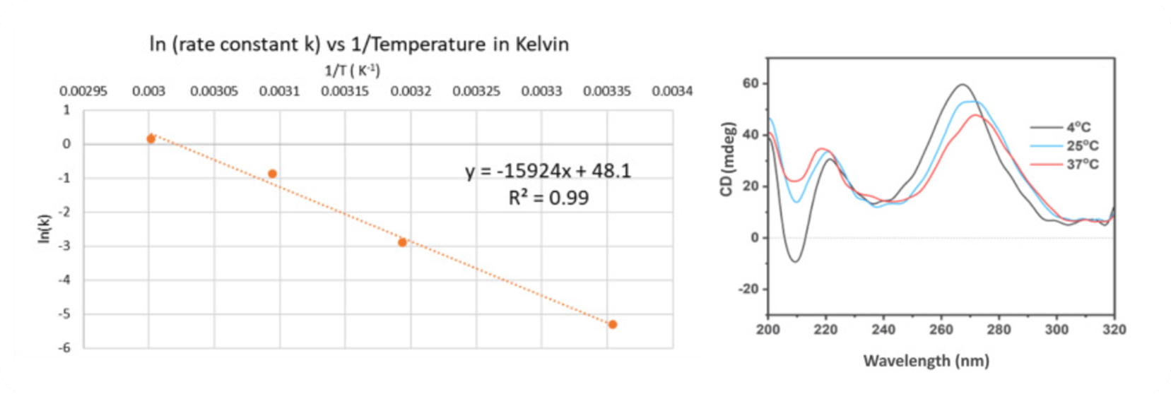 Data from Chhedaetal.,depicting natural logarithm of rate constant (ln (k)) vs inverse of temperature (1/T in Kelvin). First order rate constants (k) were calculated using the concentration in moles/mL which were deduced by assuming a molecular weight per nucleotide in RNA to be 320.5 g/mol. CD measurement was conducted after 4 days.