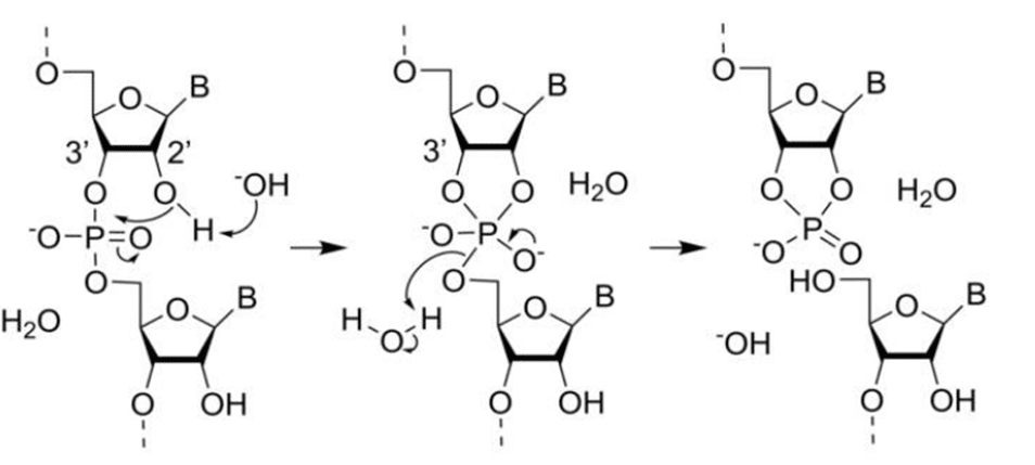 The point here is that the main RNA degradation mechanism in solution is hydrolysis. This happens due to the free 2’-OH group⁴,⁵.