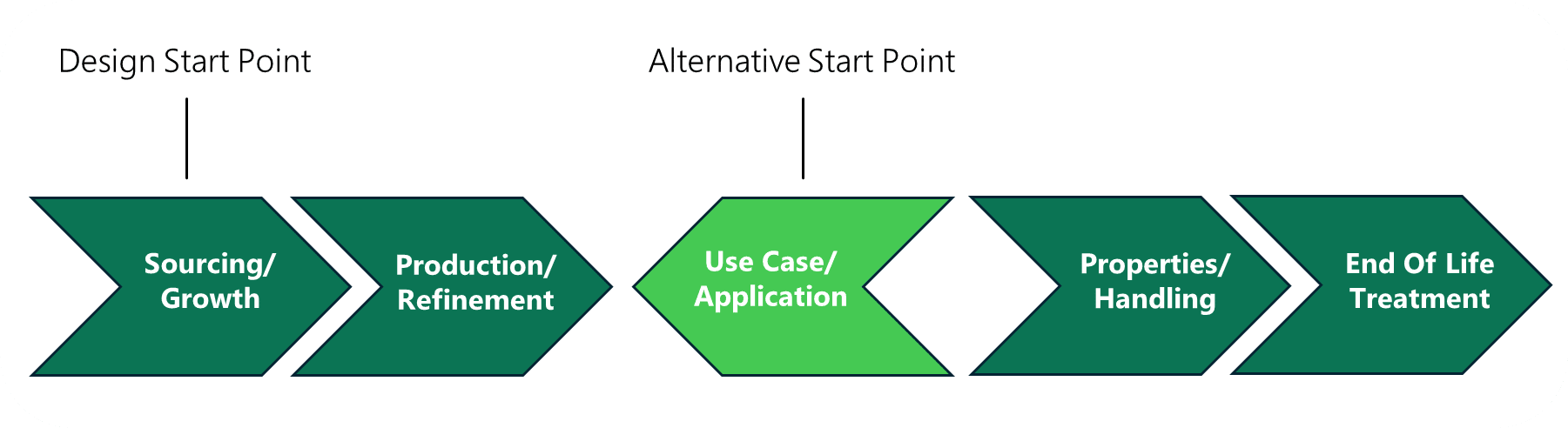 This graphic illustrates the factors that must be considered when developing more sustainable materials. The arrow for “use case” is inverted because this is often where development begins - we want a material that performs better. Under “properties,” this includes aspects of product design such as weight (which affects transport-related impacts) or safety (e.g., toxicity or radioactivity). Of note, End-of-life properties can often inspire the use of new materials i.e., sourcing.