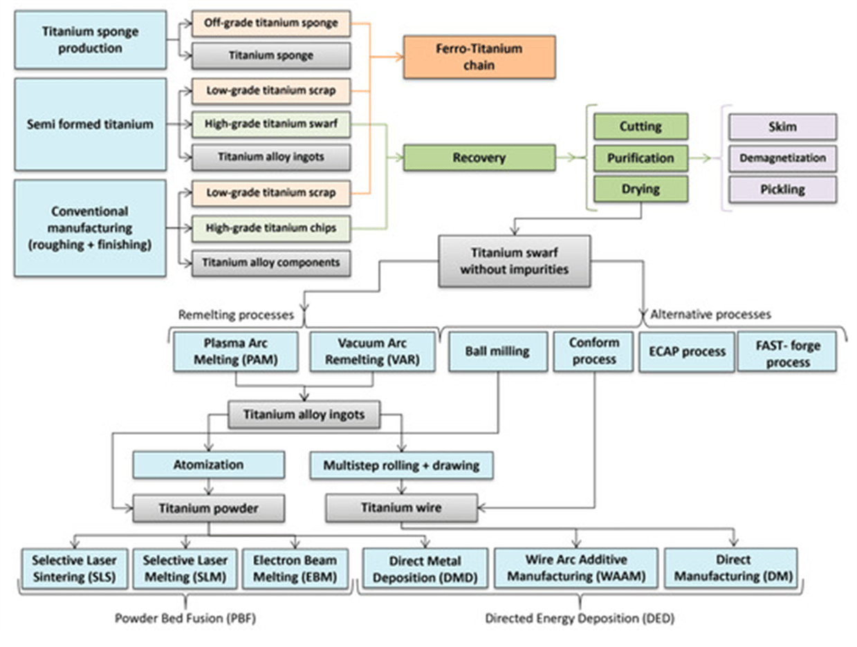 Here, Tebaldo and colleagues visualize the steps of titanium recovery and recycling using the following color code: light blue = processes; light green = recyclable materials; green = waste recovery processes; light orange = non-recyclable materials; orange = recycling of low-quality materials; grey = products or raw materials; purple = waste purification processes.