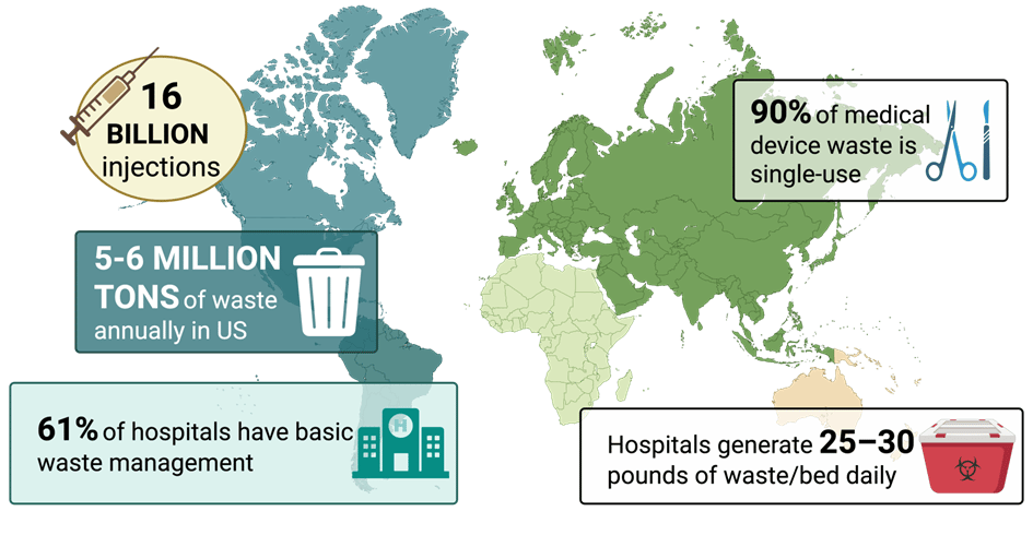 In 2024, the WHO estimated that 16 billion injections are administered globally each year. While it is estimated that 90% of medical device waste consists of single-use items (leading to more than 5 million tons of medical waste produced every year in the U.S. alone) only 15% is believed to be biohazardous. As a result, several more sustainable innovations are trying to enter the market.