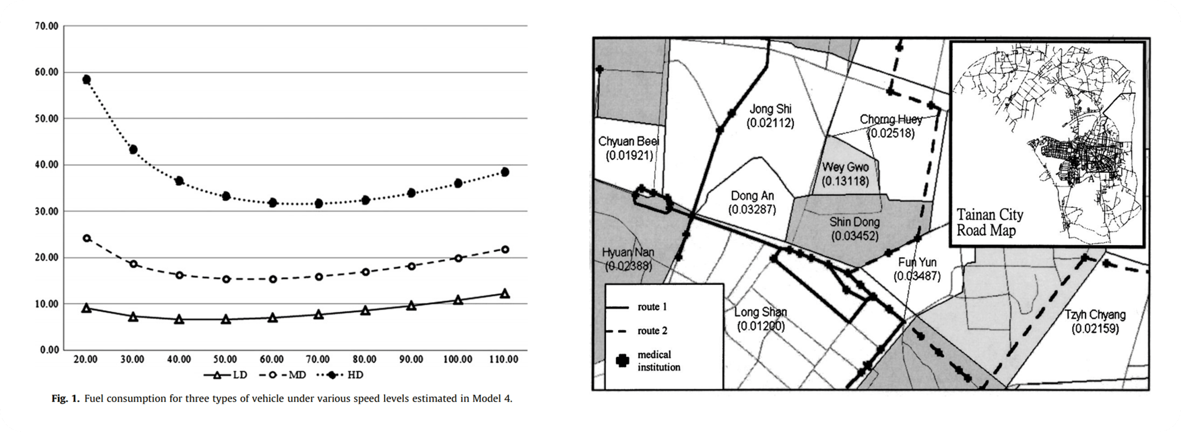 When it comes to medical waste, it must be considered that its treatment is regulated - Nematollahi et al. provide an excellent overview of medical waste treatment options. As shown in the figure on the left, transport and end-of-life treatment also incur costs; here, light-duty (LD), medium-duty (MD), and heavy-duty (HD) vehicles are compared. On the right, Shih et al. exemplarily planned a waste collection system in Tainan (a city in Taiwan), as shown on the map, which illustrates two alternative routes.
