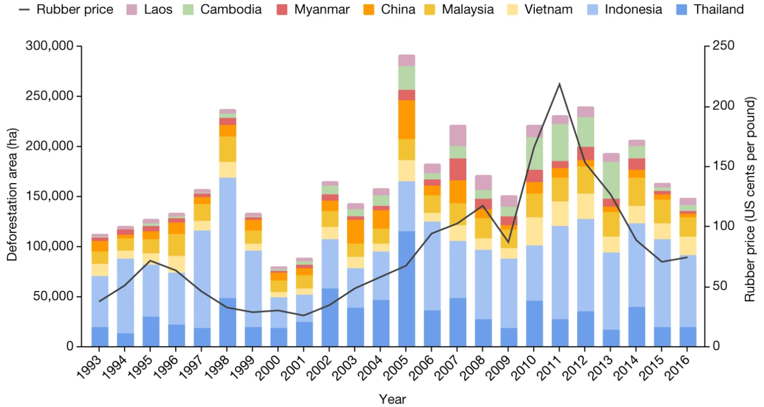 This graphic is from a publication that reviews the deforestation in Asia - DOI: 10.1038/s41586-023-06642-z. Of note, it is hard to assign the exact deforestation area as unwanted extension of fires or speculation driven eradication might play as well.