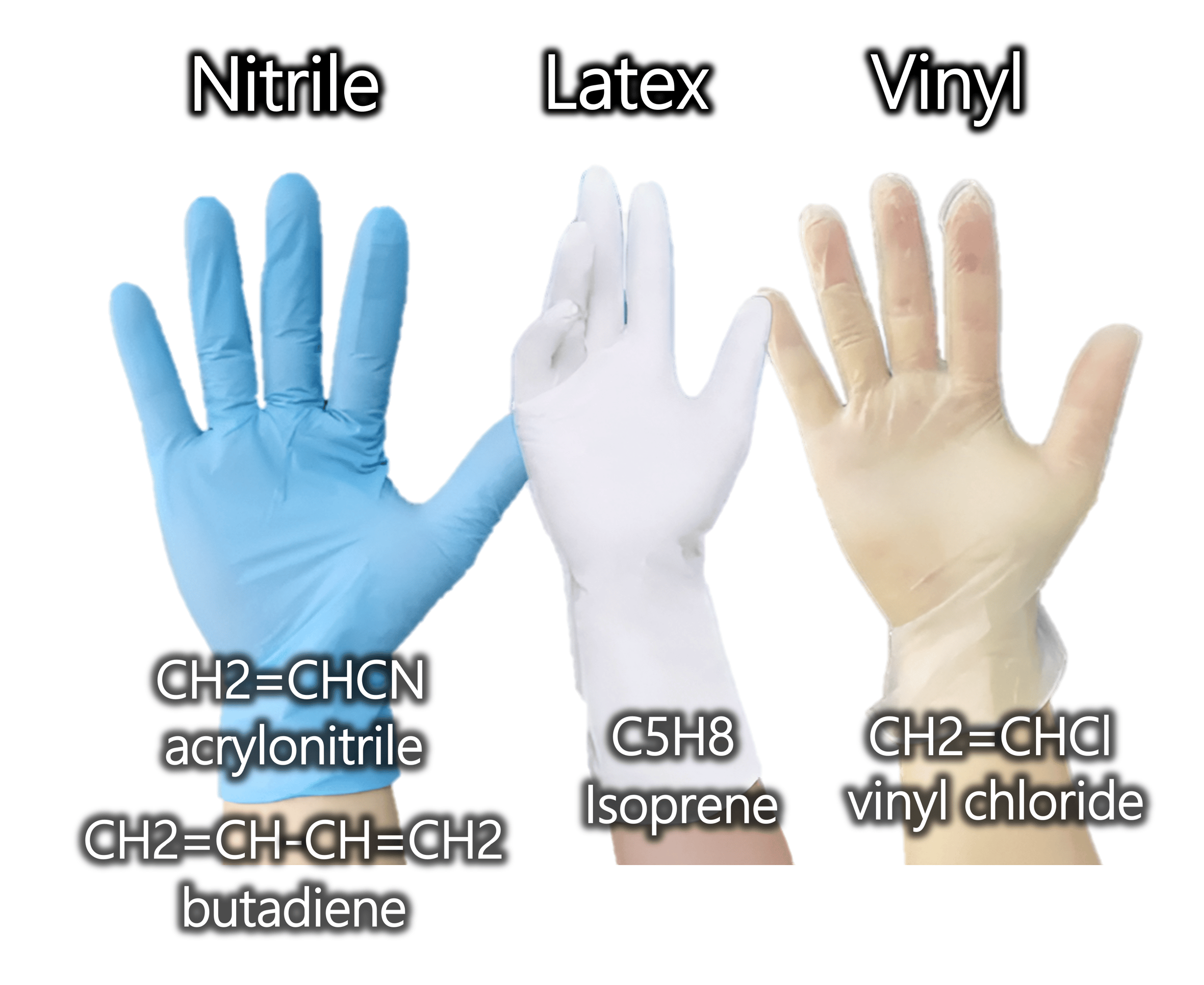 Vinyl gloves are made of PVC, a polymer created from the polymerization of vinyl chloride monomers. They are sometimes used because of their low cost, however, they are the least durable and flexible.