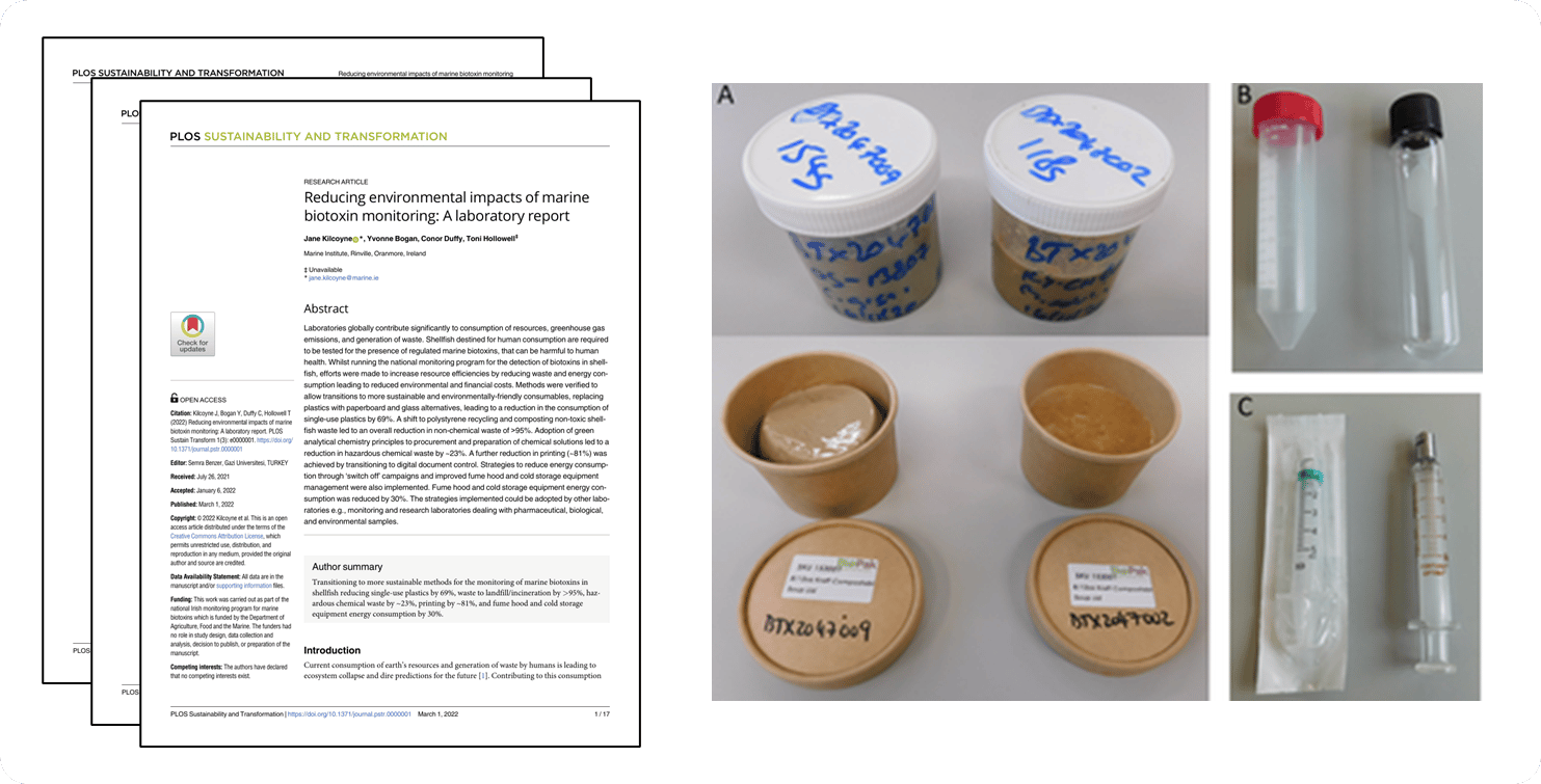 Kilcoyne, J., et al., 2022. Reducing environmental impacts of marine biotoxin monitoring: A laboratory report. PLOS Sustainability and Transformation, 1(3), e0000001. doi:10.1371/journal.pstr.0000001.