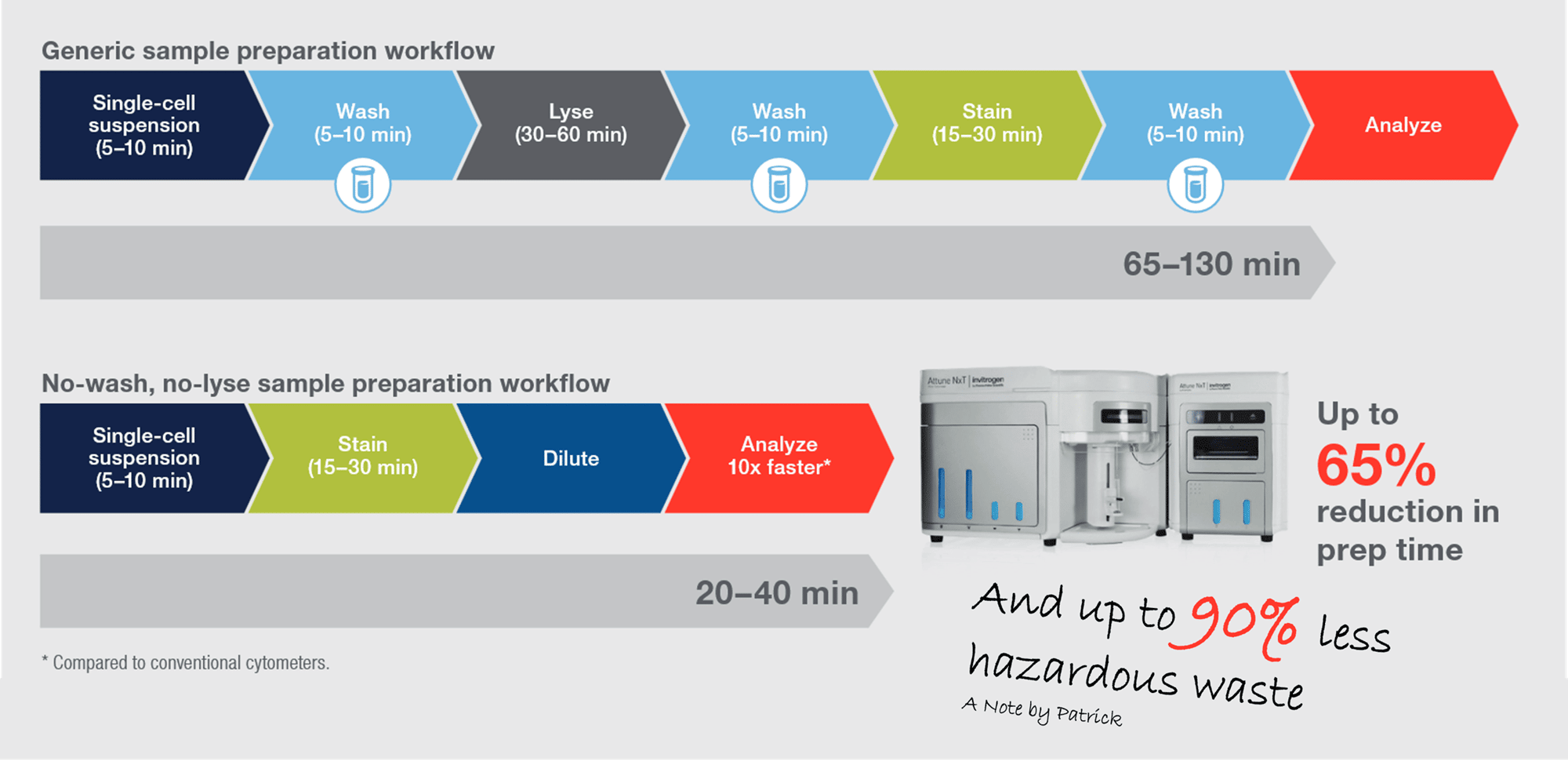 A manufacturer may develop a new instrument with lower consumption rates. But how does your company hear about it? And do you have someone you trust to know whether innovations are truly sustainable? Furthermore, internal optimization of its settings often stops once minimally sufficient data quality is achieved. It is rarely pushed to the point where the least amount of time or money is used. In large companies especially, time is a critical factor - and there is often no dedicated efficiency officer. Sustainable thinking aims to change exactly that. As you can see, I edited this graphic slightly and added a little sentence. If you are interested in the Attune, here is the brochure for you.