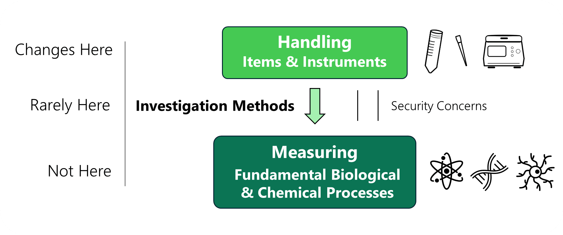 We optimize the way in which we handle the objects that help us assess our samples. We don’t want to alter anything that links to the fundamental experimental principles. Meaning we might change the gradient of our HPLC but the elution principle and resolution stay the same. The two thin lines connecting Handling and Measuring should indicate that sometimes we have to handle our items in a very specific way, as they would otherwise influence the system we measure. A slightly extend version of this article can be found here - with nuances on scientific benefits.