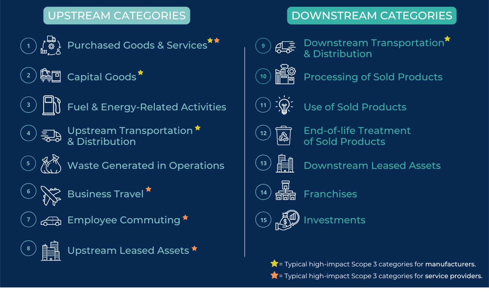 The Sustainable Solutions Corporation has created a helpful overview of the different categories of Scope 3 emissions. As you can see, there are many categories, which makes estimating them quite challenging.