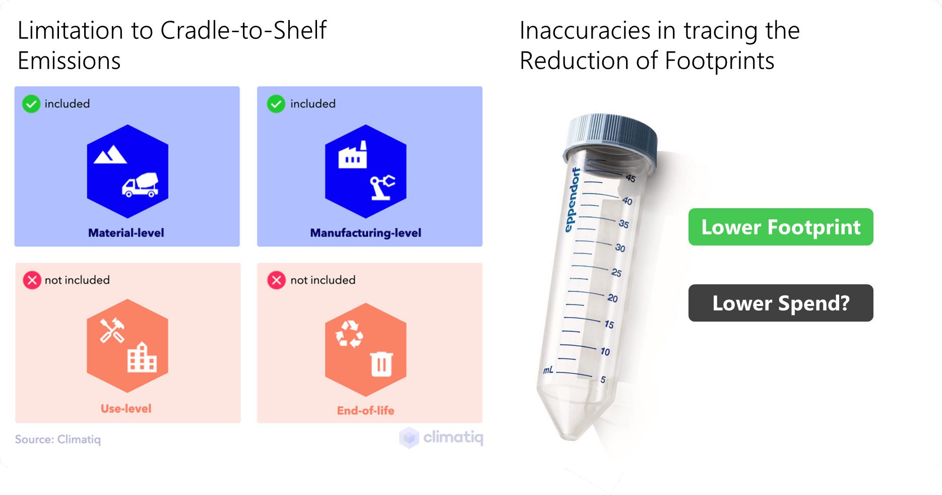 As Climatiq outlines, spend-based estimates come with the limitation that they do not include use-phase or end-of-life impacts, which need to be captured in other ways. Furthermore, if you decide to purchase, for example, bio-based tubes and they do not come at a lower price, you will not see the benefits reflected in these assessments.
