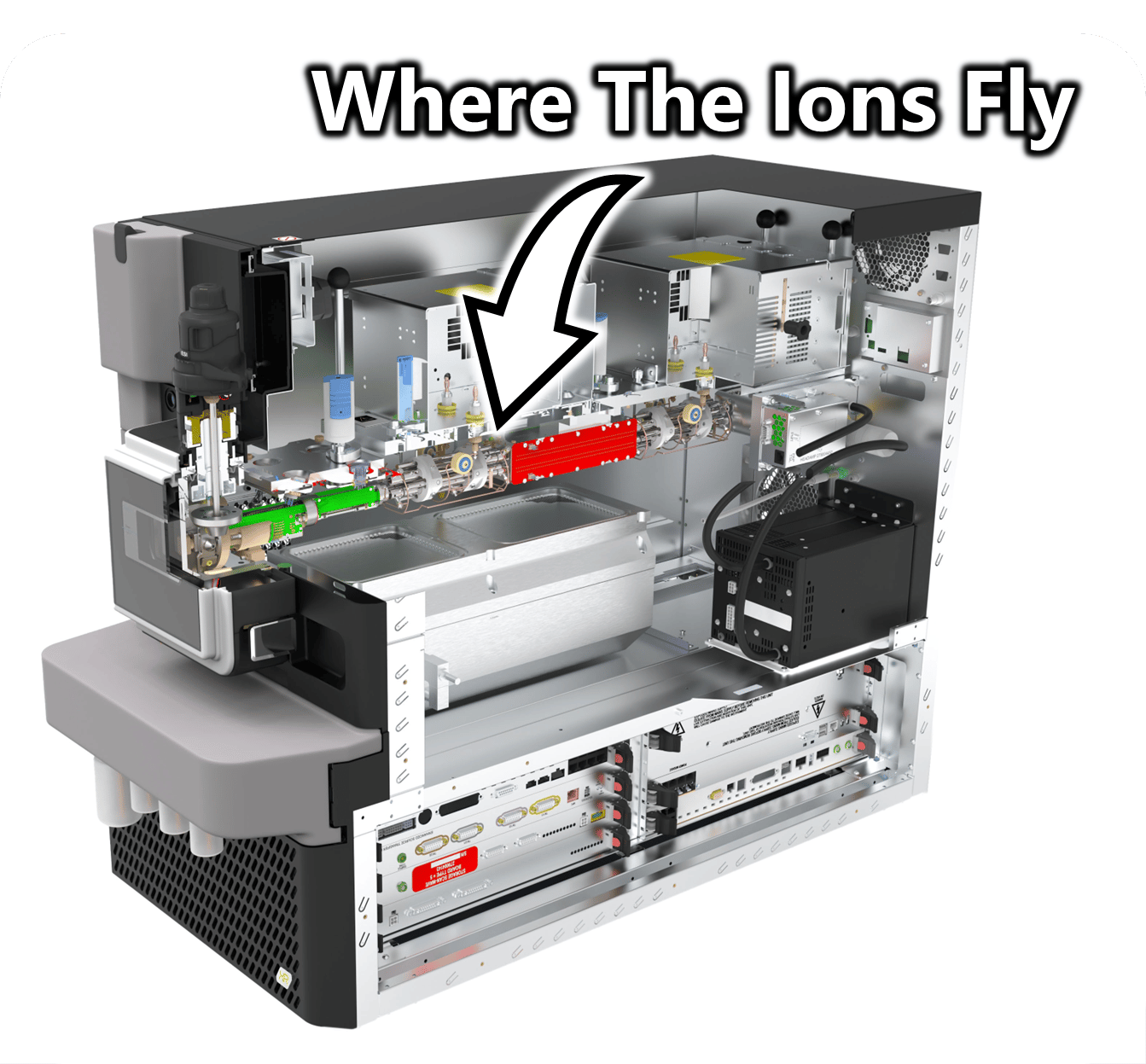 The vacuum pumps are necessary to ensure that analyte ions do not collide with gas molecules inside the mass spectrometer. However, more efficient ion-transfer interfaces, improved conductance-limiting geometries, and optimized pumping pathways allow Waters to reduce the overall number of pumps used.