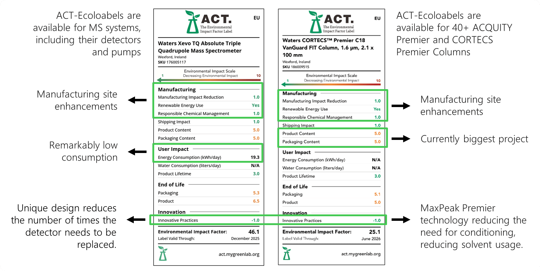 Click to enlarge. Although other companies don't measure their environmental impact by default, Waters want's to be transparent and believes in their systems. This allows you to directly compare products across vendors in a quick and transparent way. I.e., there is no longer a need to ask representatives from each company individually. Read the ACT-Ecolabels here.