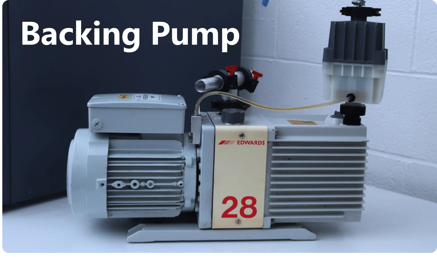 This is a rather ancient backing (or roughing) pump just to give you an idea of how it looks. It's the first stage of the vacuum system in a mass spectrometer, used to remove most of the air from the instrument and lower the pressure from atmospheric levels to the rough-vacuum range. This initial pressure reduction allows high-vacuum pumps, such as turbo-molecular pumps, to operate effectively.