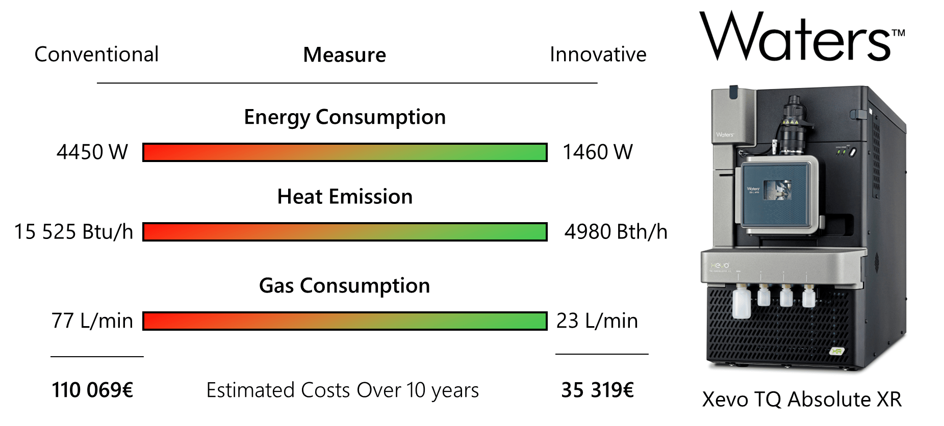 For example, Waters' Xevo TQ Absolute XR delivers among the highest sensitivity on the market but saves more than 50% of gas, and over 65% of heat and energy.