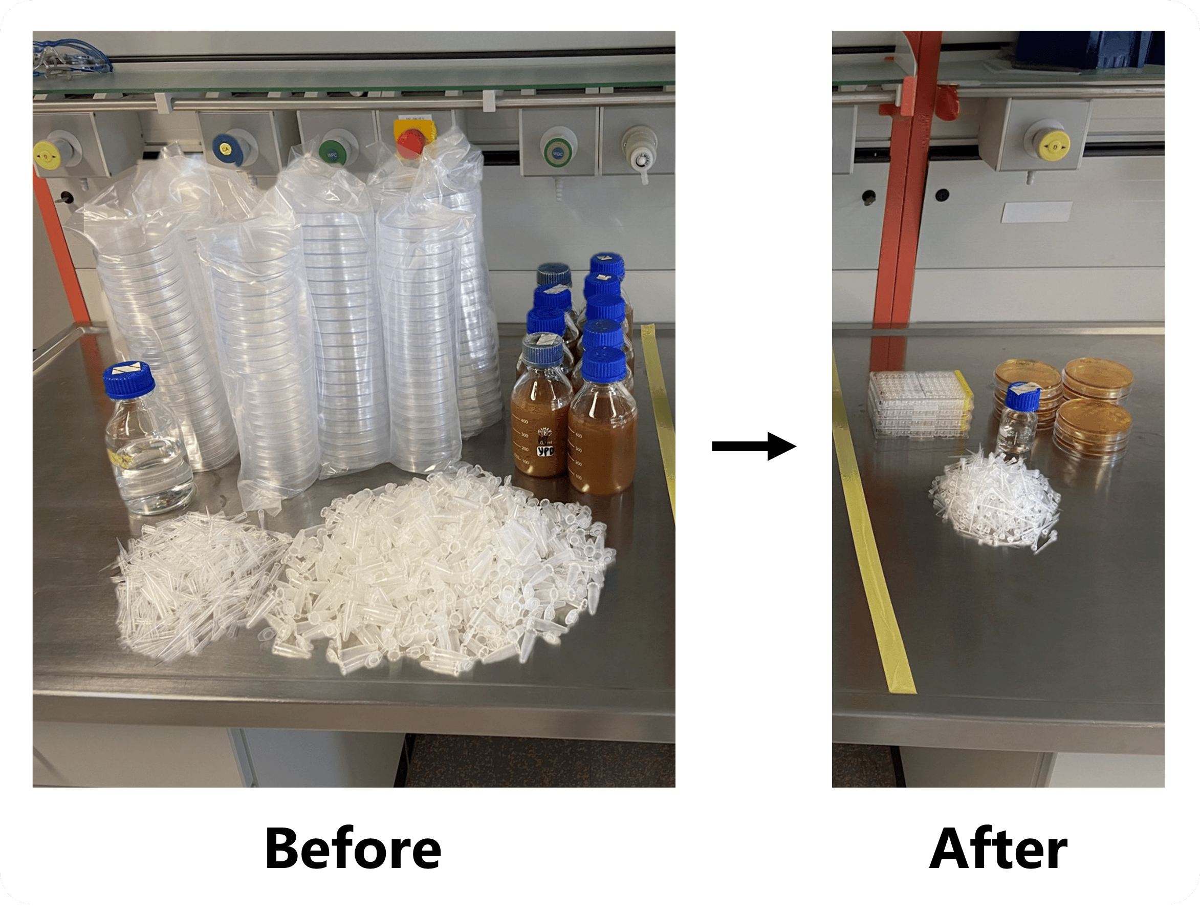 Since fewer plates are used, no spreaders are needed, and tips for a multipipette are used instead, the person I referred to and her student saved more than 85% of plastic waste.