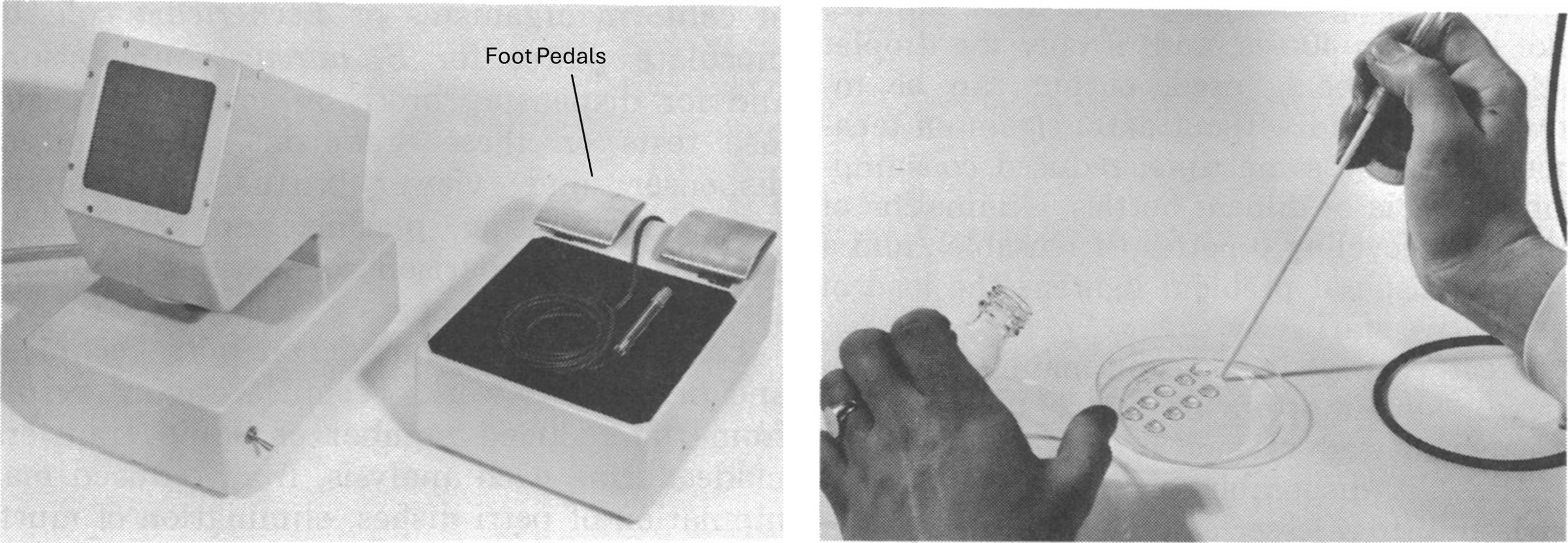 One year after proposing the drop technique, Sharpe and his group published another paper introducing an apparatus for dispensing drops. It featured a foot-operated diluter/dispenser and a projection viewer. Interestingly, the authors also suggested using thick-walled plastic drinking straws instead of glass pipettes to avoid clogging. Of course, over time, other techniques have been developed, such as track plating or single-plate serial dilution spotting.