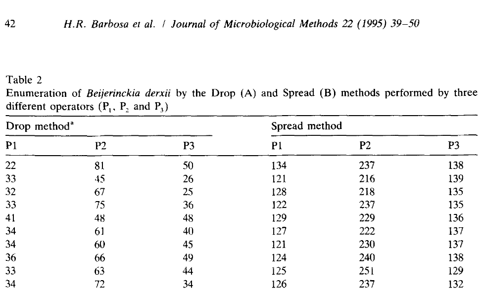 Barbosa, H.R., et al., 1995. Counting of viable cluster-forming and non-cluster-forming bacteria: a comparison between the drop and the spread methods. Journal of Microbiological Methods, 22(1), pp.39–50. doi:10.1016/0167-7012(94)00062-C.