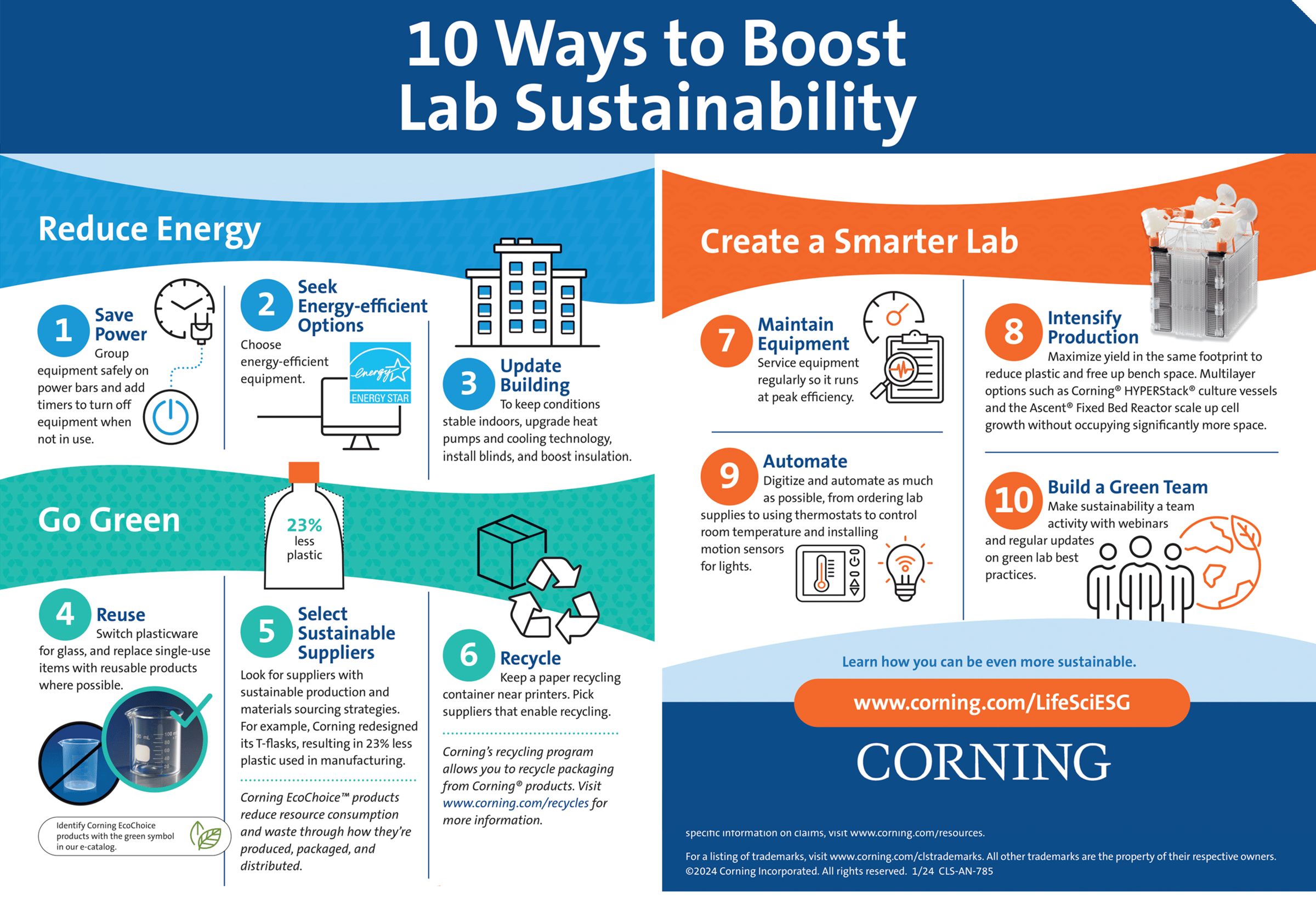 Tip: Click to enlarge. Corning has put together a poster for you, considering three main categories for action: reducing energy use, choosing consumables that minimize waste, and optimizing lab processes to support sustainability. You can find more here.