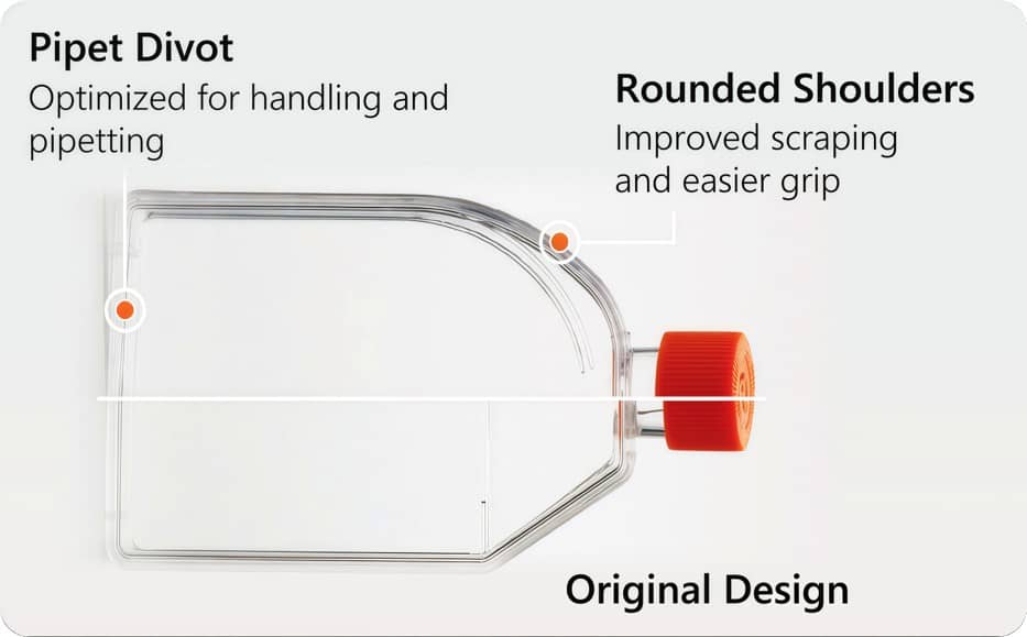 What that means: due to the round shoulders and slimmer design, the he flask contains 23% less plastic. So you can use 5 U-75 flasks for the same amount of plastic and surface area as 4 of the T-75 flasks!